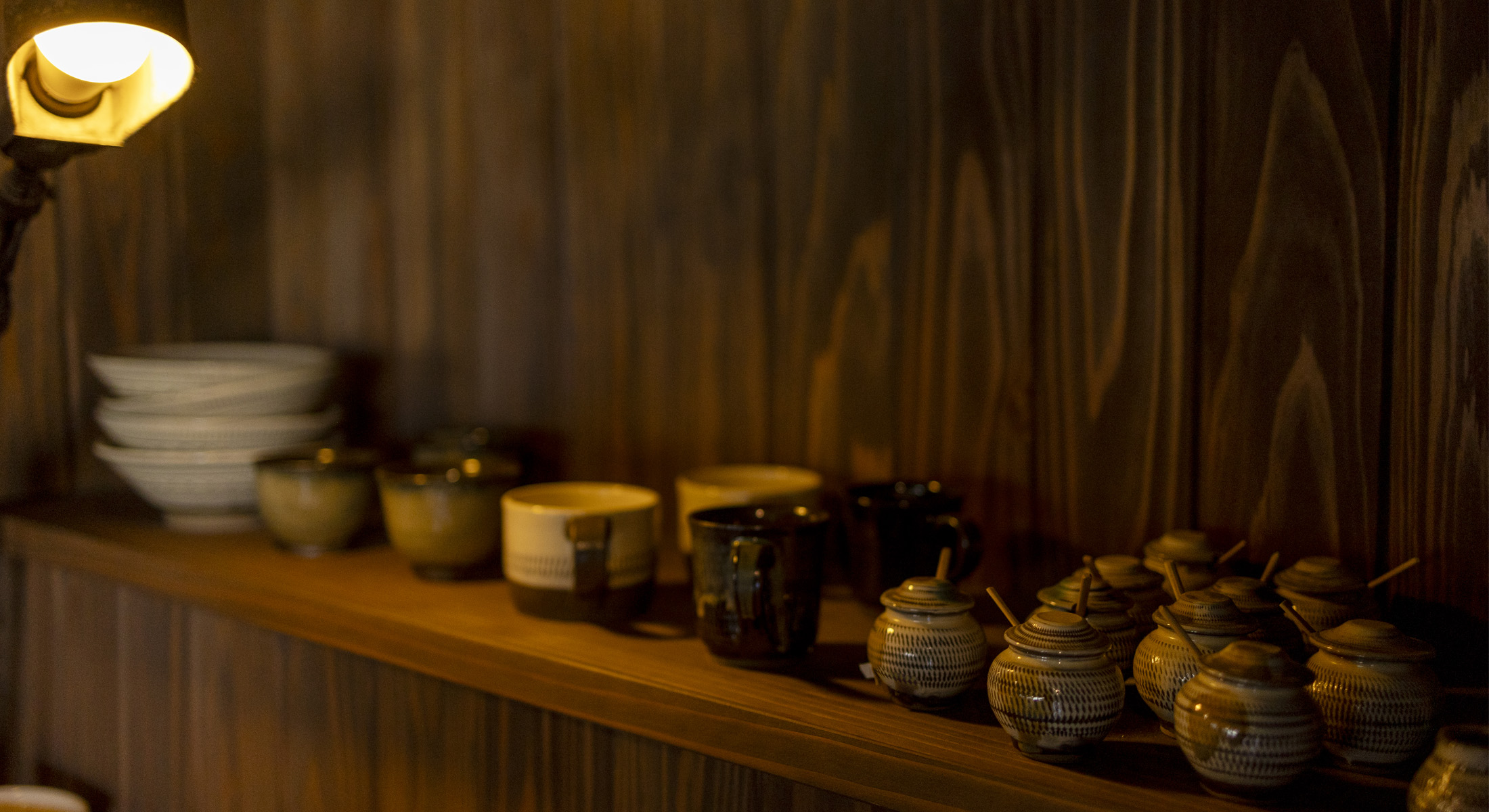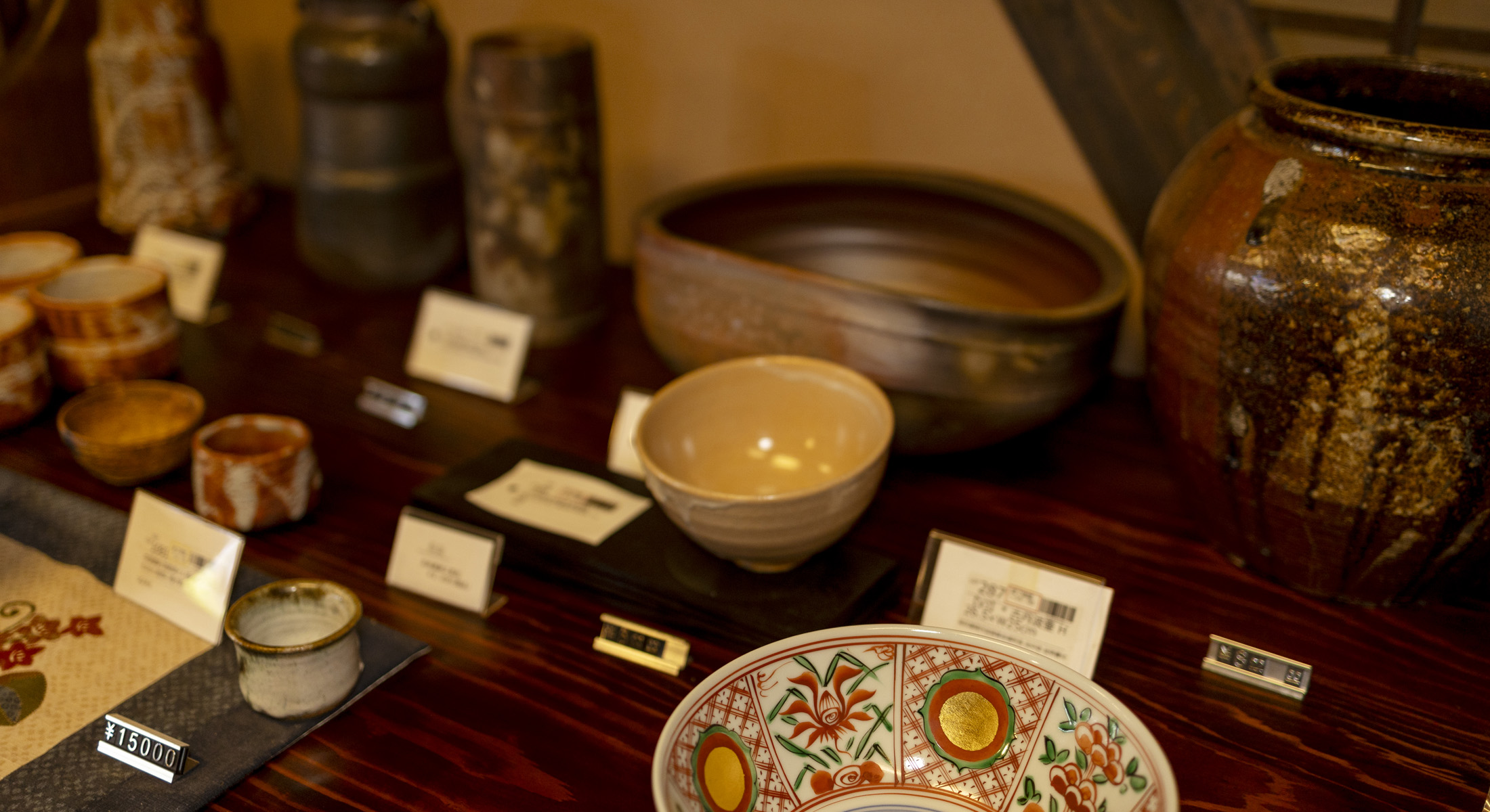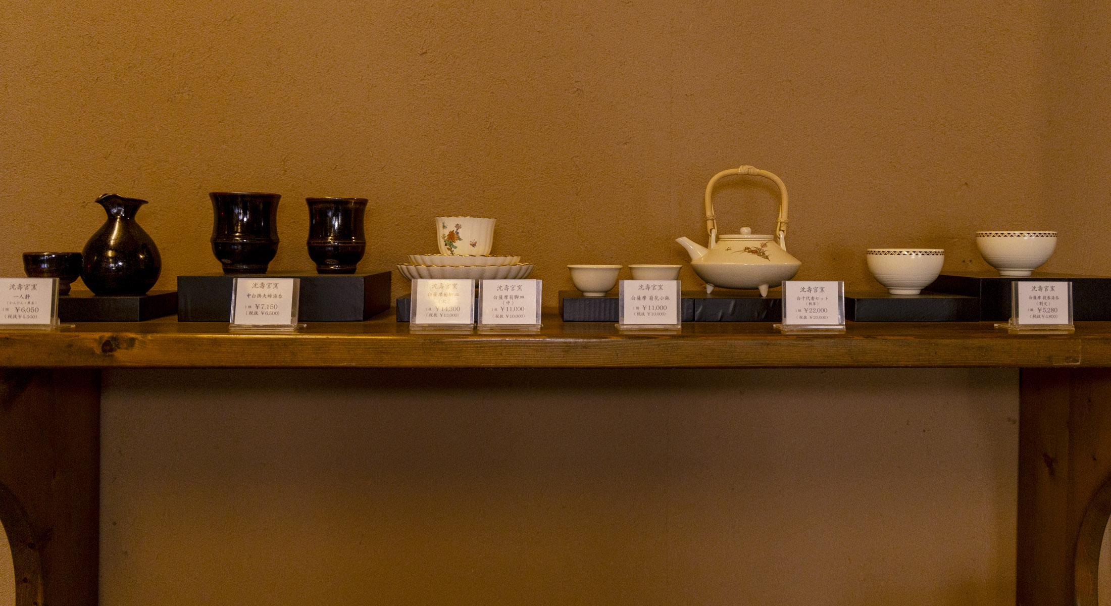 温泉側入口に隣接する山水は様々なうつわが展示されたギャラリーと、