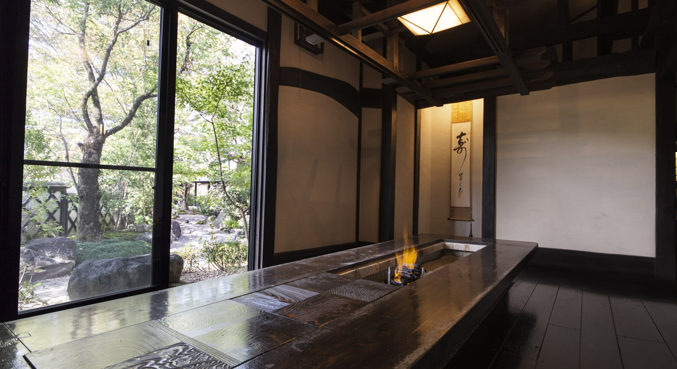 囲炉裏の個室で、宮崎牛や山女魚の塩焼きを炭火で焼いてご堪能ください。